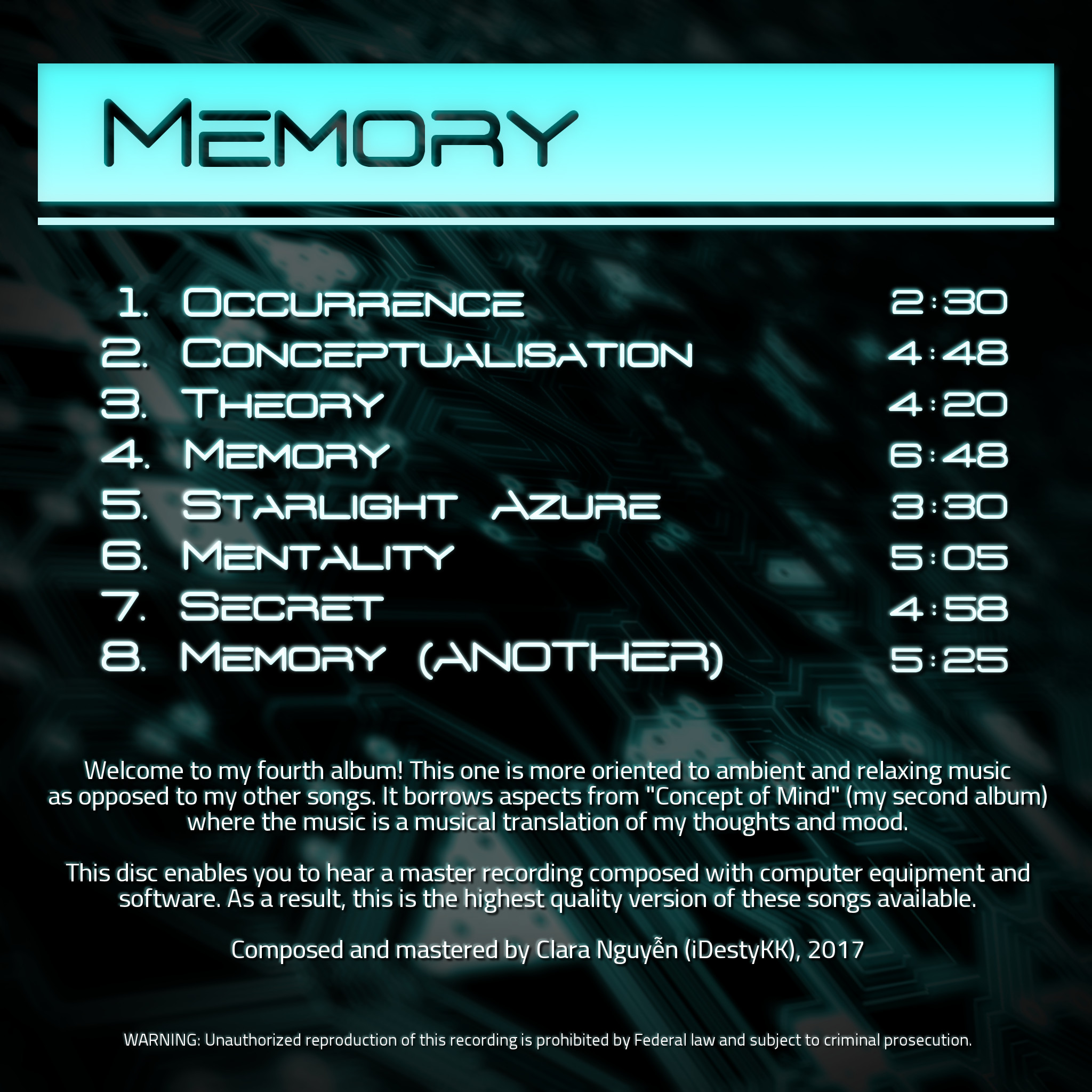 My fourth album. This album took a bit more time to make, primarily because I am still experimenting with genres of music that I can actually compose for. This one is oriented toward more ambient and relaxing music as opposed to my other works. However, it borrows elements from Concept of Mind (My second album) in that the music is a translation of my current thoughts and mood into music.