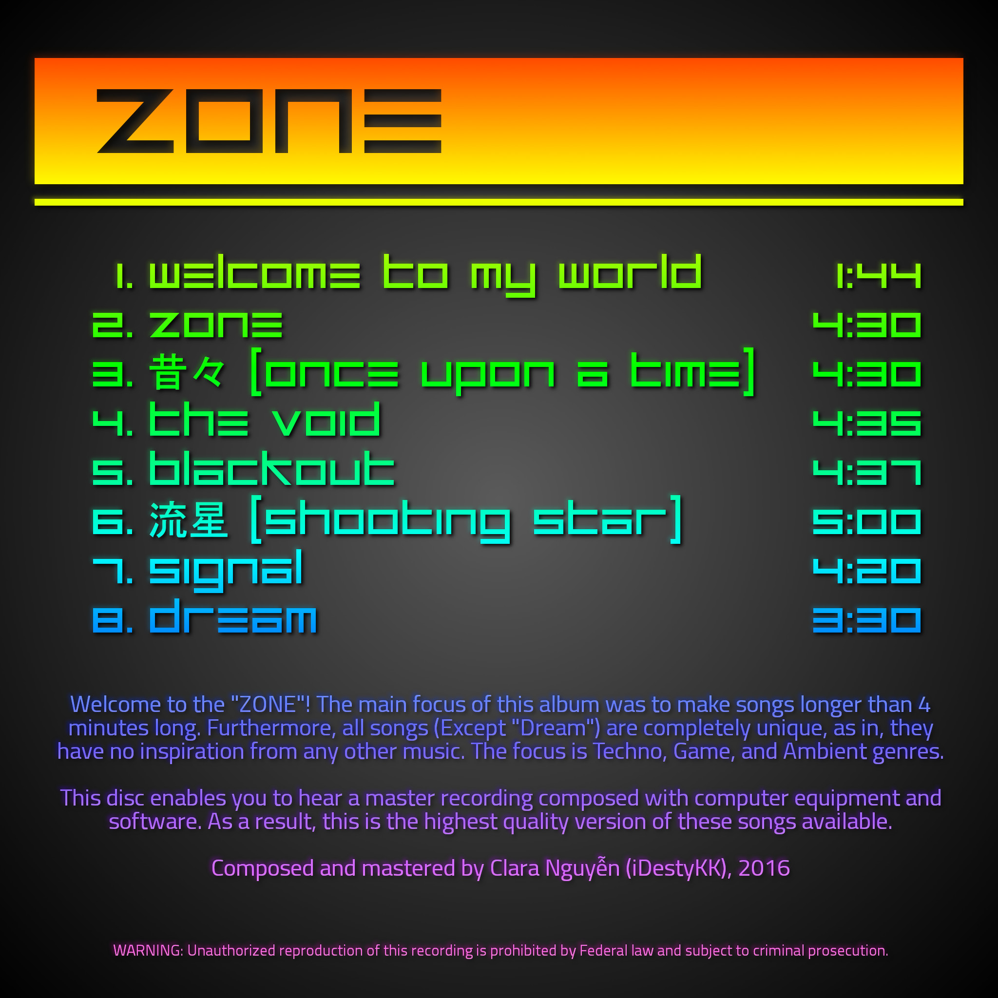 Welcome to the ZONE! This is my third album release. As of this album, my main focus was to make songs with a length longer than 4 minutes long. Furthermore, all of these songs are completely unique. As in, they have no inspiration from any other music (Except for "Dream"). Its focus is in the Techno, Game, and Ambience genres. Some songs also take advantage of clock ticking sound effects.